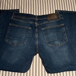 Upgrade your wardrobe with these top of the line slim straight jeans. These dark blue jeans offer a stylish and comfortable fit, perfect for any occasion.