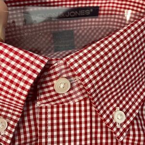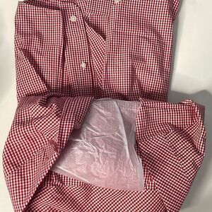 New! Me’s Medium Button down dress shirt in red gingham pattern. Pit to pit is 22.5”. New! Cotton/polyester blend material.