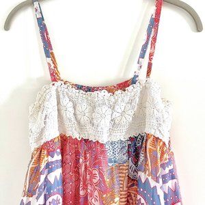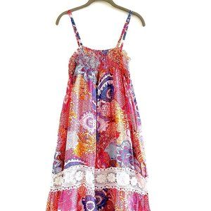 Devotion’s dreamy silk maxi dress is the perfect go-to piece for a summer event. This gorgeous pink silk floral maxi dress by the Greek brand features an ivory cotton lace bodice and trim, and a floaty skirt. The dress has a stretchy lace bodice and non-adjustable shoulder straps. Slip-on style. One-size-fits-all with an elasticized bodice in the back that can accommodate a range of sizes (see measurements). Fully lined with an attached internal white slip. Only worn a few times and in great pre-owned condition.