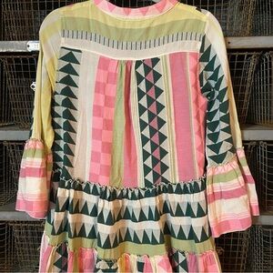 Vibrant geometric pattern. Features pink, green, and cream hues. Flowy silhouette with a V-neckline. Perfect for casual outings. Excellent condition