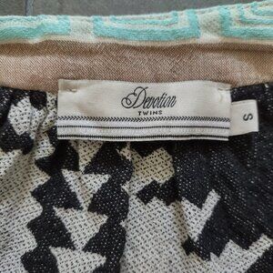 White top with multicolor woven geometric design. Raglan sleeves, button cuffs, deep v-neck. Soft and airy!