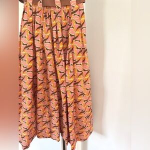 Crafted from a blend of cotton and polyester, this pull-on skirt features beautiful Peach Orange Light Green Hues and has a 35" length.