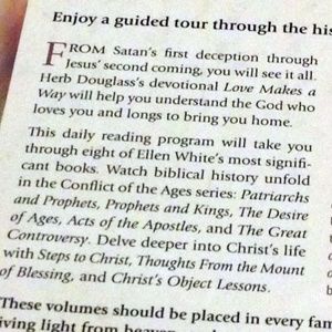 Love Makes A Way, Walking with Jesus from Eden to Eternity. Devotional, based on the teachings of Ellen G. White (Seventh Day Adventist). 2007 hardcover in good clean, used condition. A little scuffing at spine. Daily reading program takes you through eight of Ellen White's most significant books. Watch biblical history unfold.
