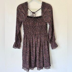 Dex Black Pink Floral Long Sleeve Smocked Tie Back Boho Mini Dress- Size S