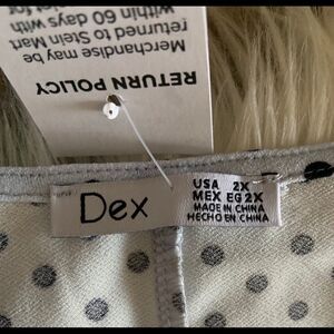 V-neck Dex polka dot. Stretchy fabric. 96% polyester and 4% spandex. Batwing Short sleeves.Button closure.Woven soft flowing fabric. This tie-front dress works for every special event on your calendar. Color light blue in black polka dot. Measurements: length shoulder to hem 47”, armpit to armpit 30” across, waist 22” across.