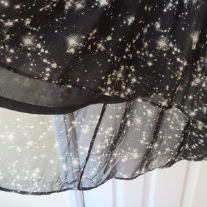 Very cute and flattering, v-neck, sleeveless, hi-lo skirt. Semi-sheer fabric with a print of glowing white stars, fully lined in black.