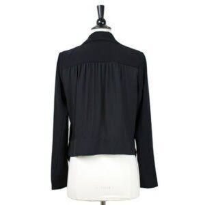 Features: Black long-sleeved blazer with shawl drape front and semi-sheer back panel with shirred detail along the top. Unlined. Open front, pointed hem in front, shorter in back, sheer back with ruffle detail. Not your average blazer!