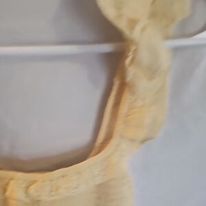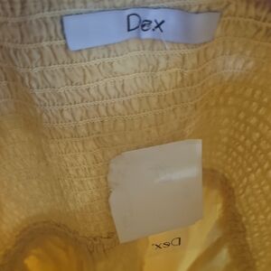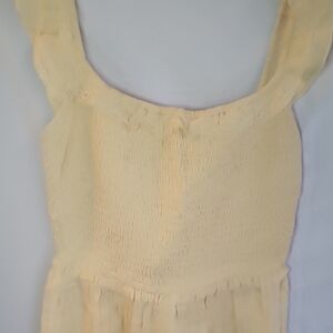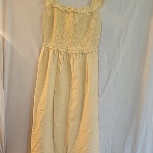 Elegant cream midi dress by Dex. Features a smocked bodice and ruffled straps. Perfect for casual outings. weddings.