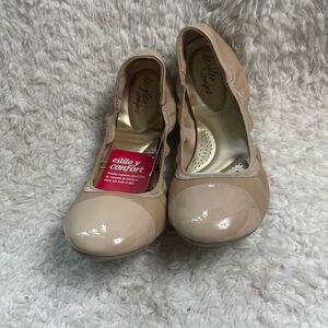 Dexflex Comfort Beige synthetic leather slip on flats patent toe& trim SZ13W.New but has small scratch on the side of both shoe see all pictures any questions please message.