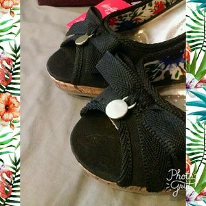 New with tags, never worn! Black canvas peep-toe wedges with floral pattern interior and gold metallic comfort-cushioned soles, black bow and gold medallion detail.