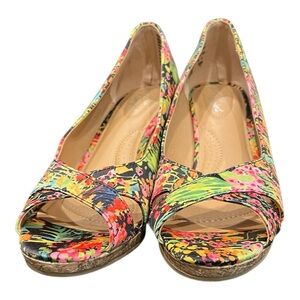 Dexflex Comfort Floral Cork Wedge Heels Size 7.5 |Bright Tropical Peep Toe