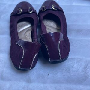 Dexflex comfort ballerina flats burgundy patent & fabric gold tone accent SZ7.5 pre owned in good used condition normal wear see all pictures any please message.