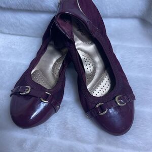 Dexflex comfort ballerina flats burgundy patent & fabric gold tone accent SZ7.5