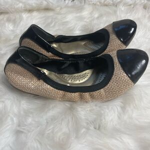 Dexflex comfort synthetic beige woven & black patent slip on flats SZ9.Pre owned in good used condition signs of wear on the inner sole has a small peeling. See all pictures any questions please message.