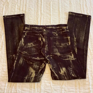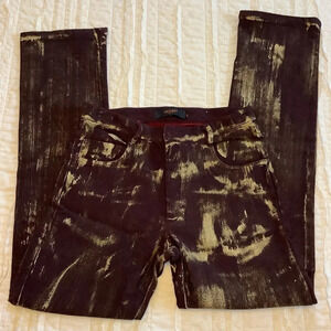 Cute dark brown with gold straight leg jeans. Inseam is 27.5”, waist 13” across and rise is 9”. In excellent like new worn condition.