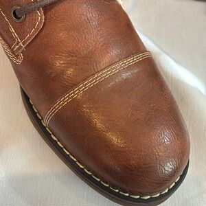 Dexter, faux cognac brown leather, faux Sherpa lining, lace up ankle boots.