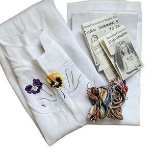 The mother dress has embroidery started but not finished. The daughter dress is untouched. Instructions included. Embroidery floss is included but got mixed up and I am not 100% sure all colors are there, you may need to find your own floss to complete.