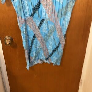 I’ve used this dress as a blouse by pulling up the “scrunch” over my thighs and wearing leggings. There is a small but unnoticeable snag on the back left as shown in photo. Dress has a tie in the back.
