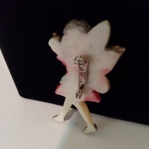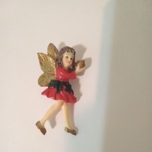 The Vintage Dezines The Fairy Collection Red Dress Wings Brooch Pin is a unique and whimsical piece of jewelry from the 1990's. As an original collectible item, this vintage brooch adds a touch of magic and charm to any fashion ensemble. Perfect for those who appreciate vintage and antique jewelry with a touch of romance and imagination. She appears to be holding a Golden pomegranate! She is made of some kind of plastic material. She measures 2.5 inches high by 1.5 inches wide.