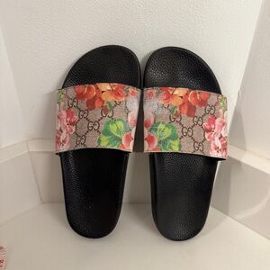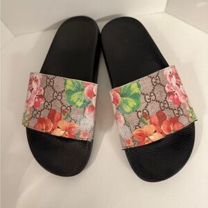 Dhgate pursuit slide sandals in monogram blooms. Women’s size 8. Pre-owned, well worn. Major fading and scuffs and black glazing has come off of edges of strap. The flaws do not affect wear but please review photos carefully for condition. Final sale, priced for condition. Thanks for looking!