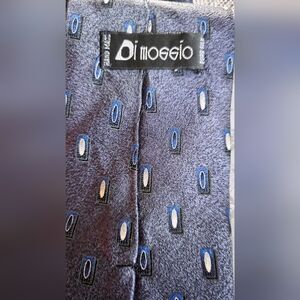 Hand Crafted from a luxurious silk blend, this elegant Di Moggio neck tie is a refined choice for any professional wardrobe. It features a geometric pattern with a striking navy blue, black and silver color scheme, offering a contemporary take on classic preppy style. The tie measures 60 inches in length and 4 inches in width, making it a versatile piece for various knot styles and fits.