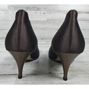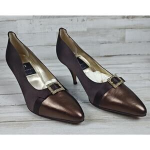 Di Sandro Pumps Brown Satin/Metallic Bronze Leather W/Rhinestone Buckle US9/EU40