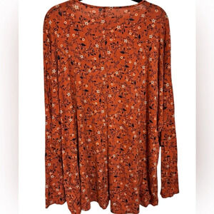The size tag was removed (it kept sticking out) but it is a size 2X, or 22/24. The fabric is very soft and stretchy. It is so comfortable to wear. It has batwing sleeves and a v-neck. There’s a little rouching at the waist. It’s really flattering. I’m not sure of the brand but I got it through Dia & Co.