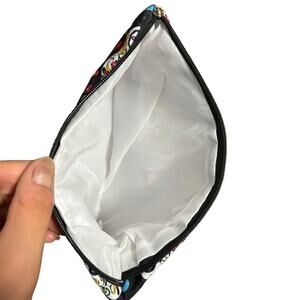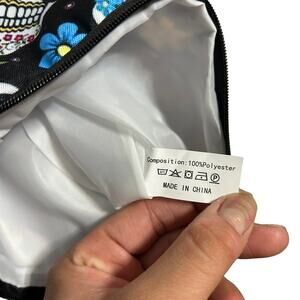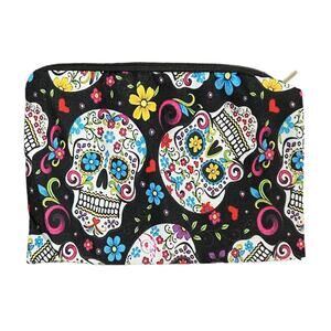 Black with large white sugar skulls and colorful Dia de los Muertos decorations all over