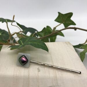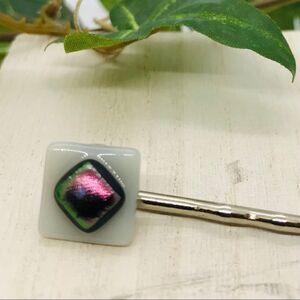The diachronic glass square has been placed in a kiln and then glued onto a new silver bobby pin.