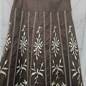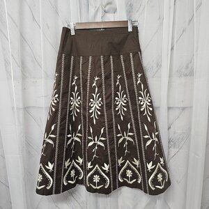Dialogue Brown Cream Floral Embroidered A-Line Boho Midi Skirt Size 4