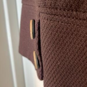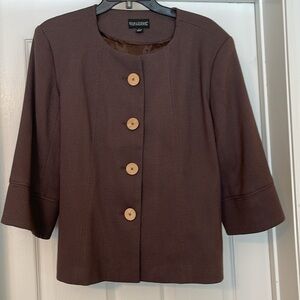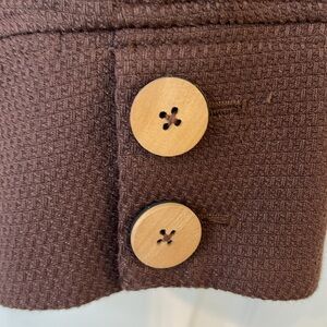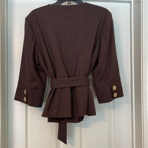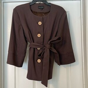 Dialogue Fully lined brown belted (or worn without belt) jacket. Four wooden style button closures down center front with two buttons in each 3/4 length sleeve cuff. Slightly padded shoulder and the jacket has a little weight to it. in good pre- owned condition Size L