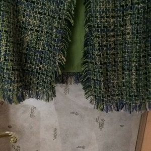 One closure tweed jacket with fringed collar, sleeves, and hem. Beautiful combination of blue, green, lavender and pinky beige.