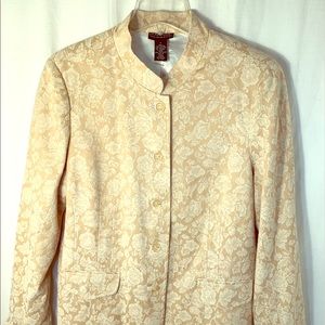 Dialogue button front jacket two pockets goldish with white rouse, turn cuff up or down lining is 100% poly the outside is 68% Cotton 30% polyester 2% spandex fully lined pit to pit 24 inches length is 27 inches
