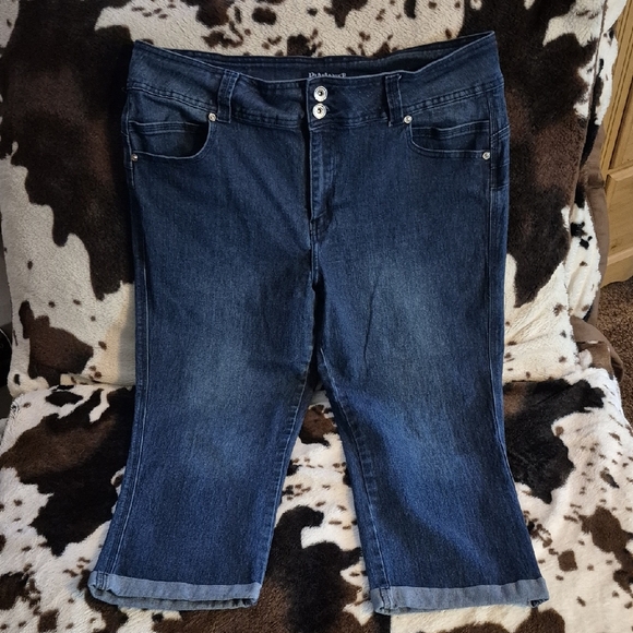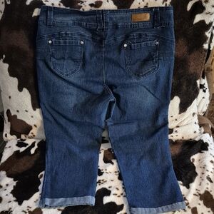 Stylish dark wash cropped jeans capris perfect for any casual outing. Features a comfortable fit and classic design. MEASUREMENTS ARE BELOW APPROX.