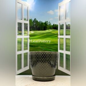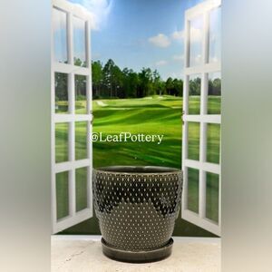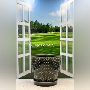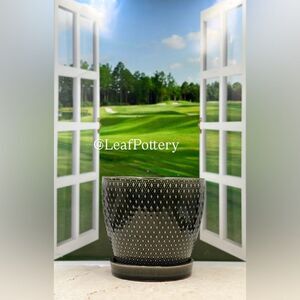 Dimensions: 6”H x 6.5”W, Opening 6”, weight 2lbs 8oz, Material: Ceramic, Drainage hole, saucer attached to the planter, Color: Black/Gray, Type: Barrel planter, Made in China , Perfect for Indoor/Outdoor gardening, Don’t forget to dress up your plants 🪴