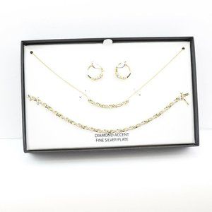 Say yes to spectacular with this three piece jewelry set which includes a diamond accented infinity theme. Set includes hoop earrings, collar necklace and matching link bracelet.