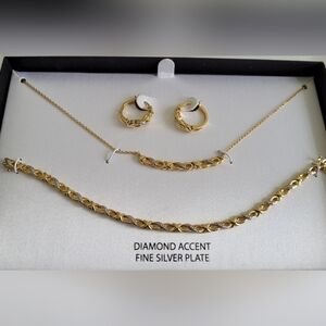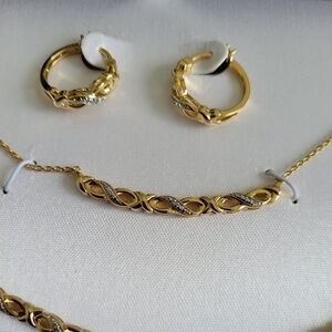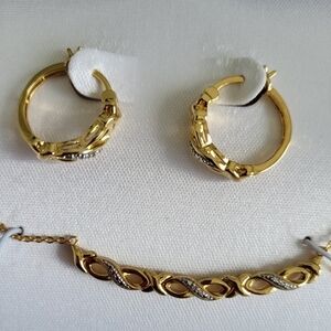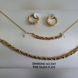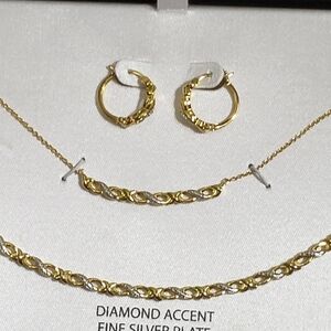 This exquisite diamond accent gold and silver infinity necklace with hoop earrings and a bracelet set by Silver Core will look fabulous for special occasions! Necklace has lobster claw clasp and is approx 17"..Bracelet has a clasp where one end fits into the other end is approx 7"... hinged snapback hoops approx 3/4"