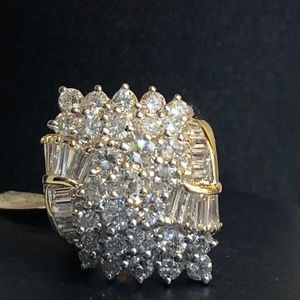 14 k white and yellow gold> Round brilliant cut diamonds 29 stones -2.73ct Quality G-SI. Baguette cut diamonds,20 stones-1.50ct G-VS. Finger size can be adjusted at our store. Big showy ring - dress to impress. Beautiful timeless design.