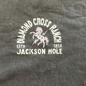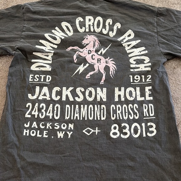 Diamond Cross Ranch tee in a faded charcoal gray with graphic on back in pink & white. Also a small graphic on front. Shirt worn two times. Men's also. Price firm. No refunds.