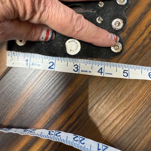EUC is a black leather hair glove with silver tone snaps and studs.