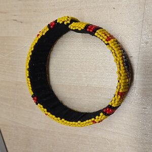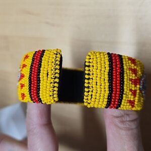 GUC: Diamond Design Wide Beaded Cuff Bracelet. Yellow, Red, Black and multicolors beads. Fabric interior lining. Circumference 9.5". Tribal or Southwestern style.