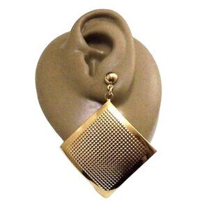 Textured center diamond discs dangles pierced hypoallergenic post earrings vintage gold tone reflective metal finish smooth wide band edge round stud top bead. In excellent vintage condition. Measures 2 1/8 inches long 1 1/2 inches wide.