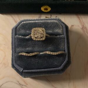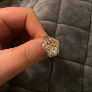 Round cut center stone with cushion shaped halo supported by a band on each side