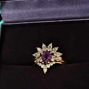 These rings have been cleaned and valued by a local jeweler at $4350.00. Diamonds 1.625 CT. Amethyst 1.5 CT. Gold 18K Yellow Gold. Total weight 8.3 Grams. Ring is a size 9. Amethyst has been highly esteemed throughout the ages for its stunning beauty and legendary powers to stimulate, and soothe, the mind and emotions. It is a semi-precious stone in today’s classifications, but to the ancients, it was a “Gem of Fire", a Precious Stone worth, at times in history, as much as a Diamond