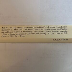 Floral Square Floral Style 14 kt. White Gold Pendant on black braided rope.