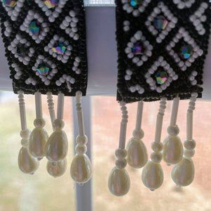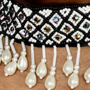Shiny and colorful Handmade chic choker necklace set made with fabric, beads, sequins in diamond weave pattern. Finished with beautiful bead tassels.
