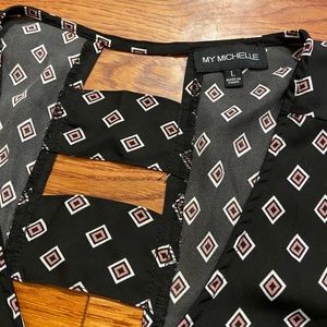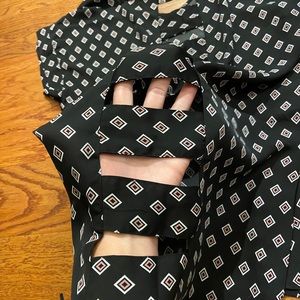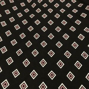 Black blouse with pink and white diamond pattern; open ladder-back