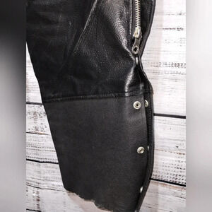 These heavy-duty XL black diamond plate buffalo leather chaps are ideal for individuals who appreciate the moto and biker aesthetic, particularly Harley and other motorcycle riders. Although there is some wear on the hems, they are in good condition and come with zippers and snaps on both sides.