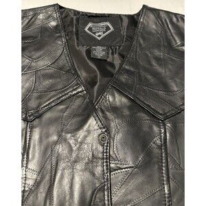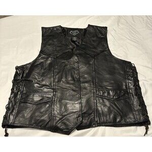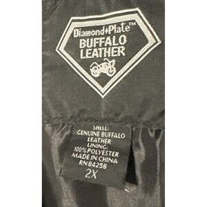 The Diamond Plate Buffalo Leather Vest in 2XL is a stylish and functional piece of men's clothing perfect for riding. Made from black leather with a polyester lining, this short jacket features a lace-up and snap closure, along with embroidered accents. The lightweight design makes it suitable for all seasons, from summer to spring and fall. Perfect for biker enthusiasts, this vest is a unique and durable choice for outdoor activities.