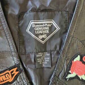 Design: Patchwork leather construction with V-neck and snap-front closure (snaps branded DIAMOND PLATE)
